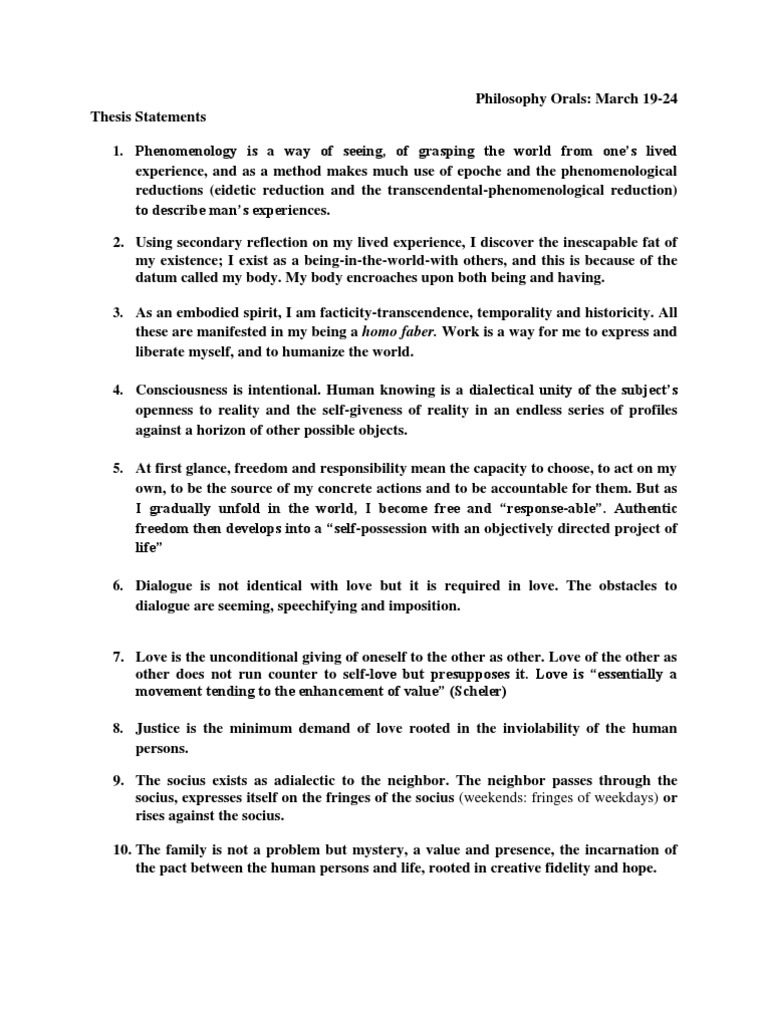 A thesis statement is one sentence that expresses the main idea of a research paper or essay, such as an expository essay or argumentative essay. It makes a claim, directly answering a question. Generally, your thesis statement can be the last line of the first paragraph in your research paper or essay. The thesis is your argument, philosophy thesis statements opinion, and your point. What is a Thesis? In philosophy papers, your thesis will state a position or claim.